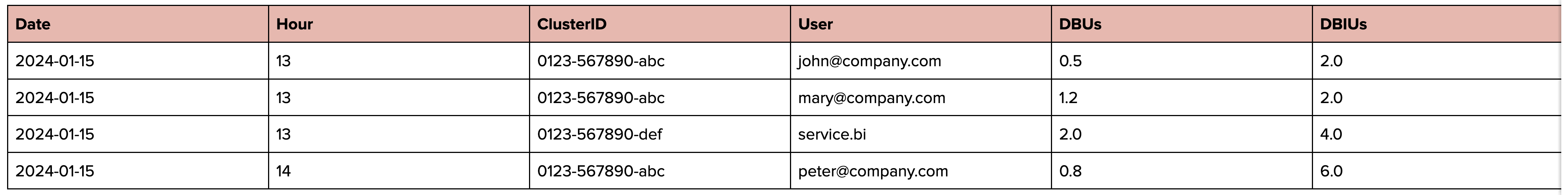 User DBUs = Cluster DBUs in Hour X × User Usage %For example: