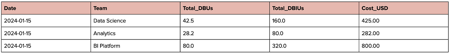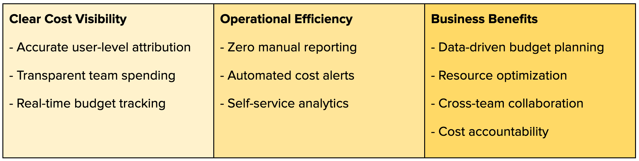 The key to accurate team cost attribution lies in our user-to-team mapping approach. By first capturing detailed user-level costs and then joining with team membership data, we solve the shared cluster attribution challenge elegantly.