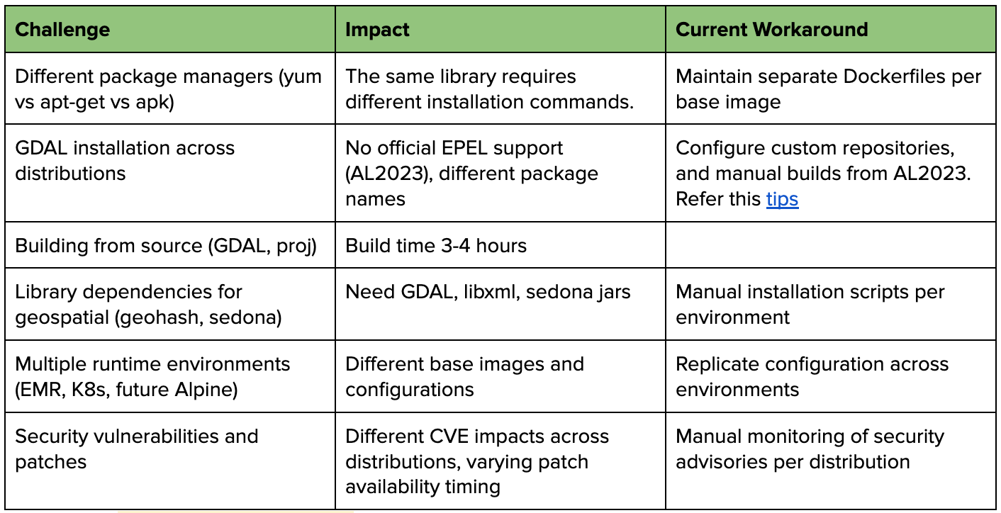 Managing system dependencies for data processing applications across different environments has become increasingly complex and time-consuming, particularly when supporting geospatial workloads in EMR, Kubernetes clusters, and potential future Alpine-based lightweight containers.