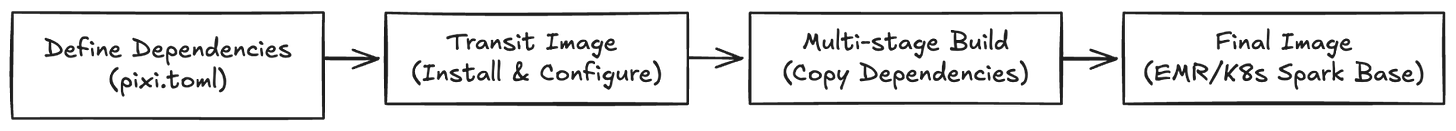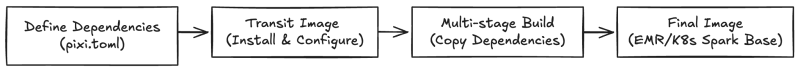 This solution not only simplifies dependency management with a single pixi.toml configuration but also enables modular, specialized images for different workloads (standard, geo, ML) while reducing maintenance overhead and improving build performance.