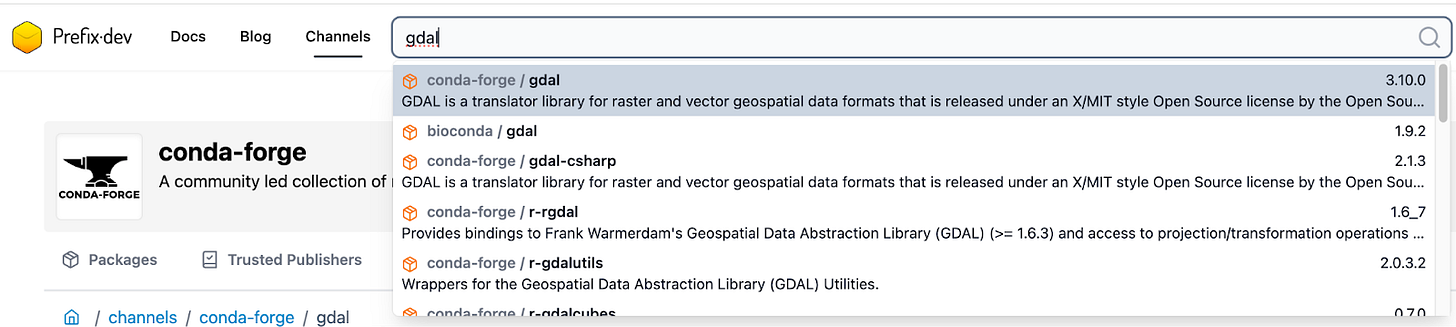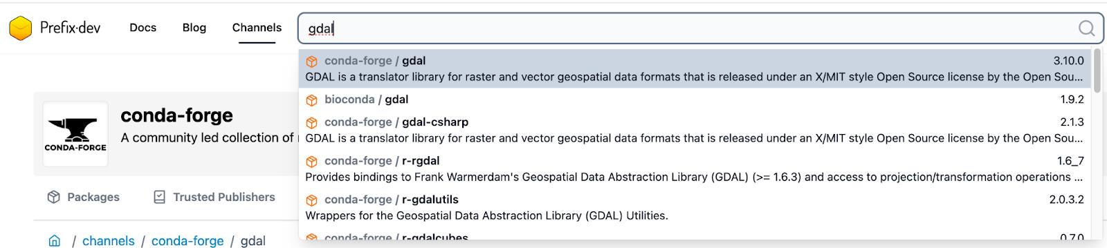 s3fs = "==2024.10.0"While package names differ between package managers (gdal-devel in yum vs libgdal-dev in apt), conda-forge provides unified package names. You can easily find the correct package name by searching the conda-forge channel at https://prefix.dev/channels/conda-forge. For example, search gdal